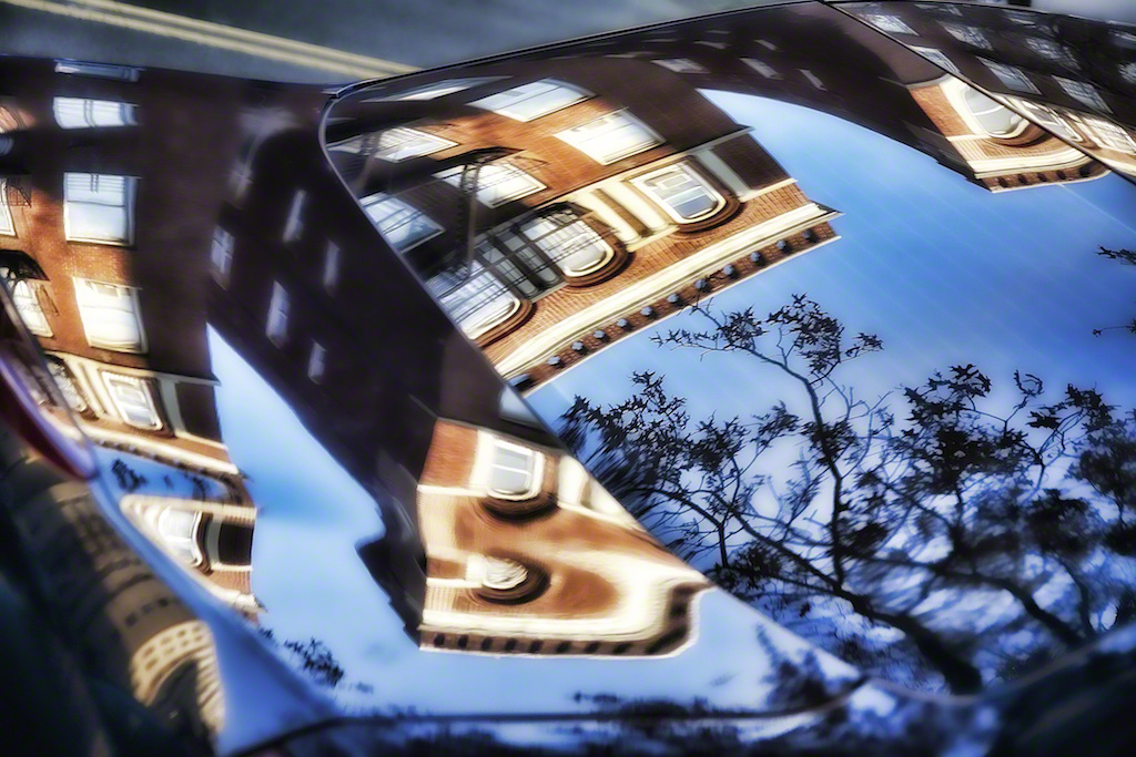 Sunlight bounces off of windows on the north side of 207th Street onto an apartment across the street on the south side.